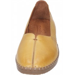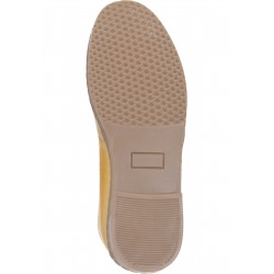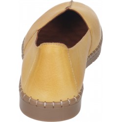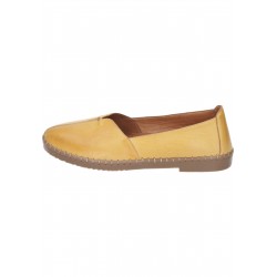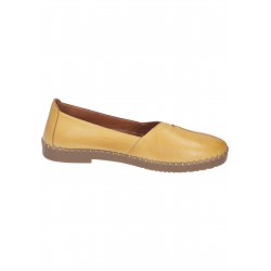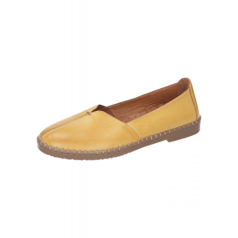 Moteriški, odiniai, su lygiu padu bateliai, geltonos spalvos. Bateliai lengvai įaunami. Bateliu padas apsiūtas siūlėmis.