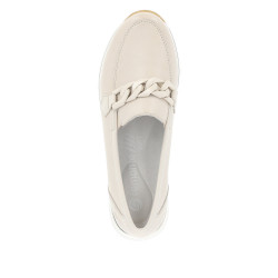 Smėlio spalvos bateliai dekoruoti įvairiomis detalėmis.