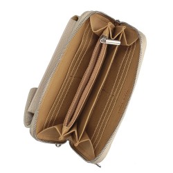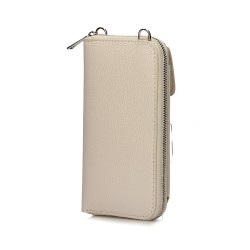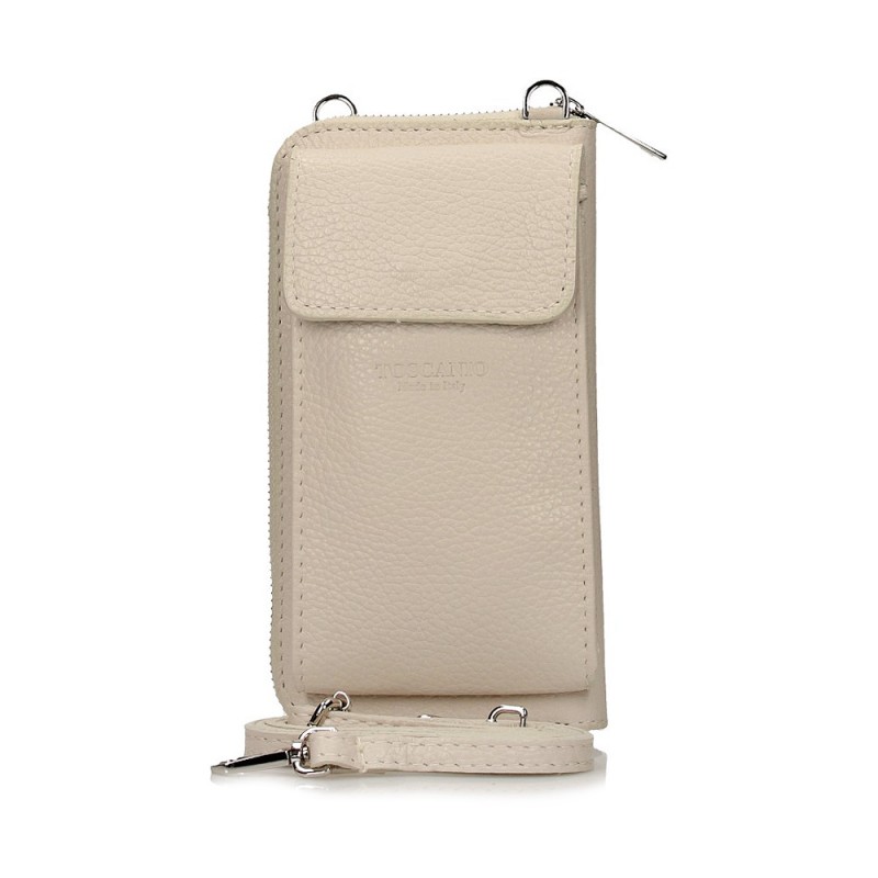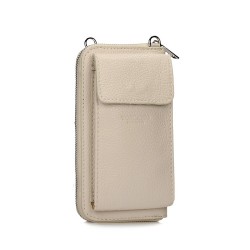 Rankinė iš natūralios odos, su dviem skyreliais, vienas jų užsegamas segtuku, skirtas telefonui laikyti, o kitas užsegamas užtrauktuku, su vienu uždaru skyreliu viduje ir dėtuvėmis kortelėms bei banknotams. Rankinė kabo ant reguliuojamo dirželio.