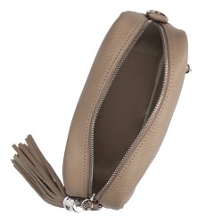 Rankinė pagaminta iš natūralios spalvos odos, su vienu užtrauktuku užsegamu pagrindiniu skyriumi, viduje yra viena mažesnė kišenė ir viena papildoma išorinė.