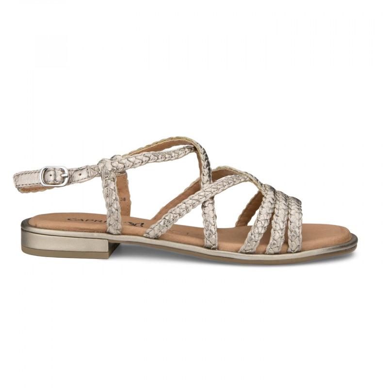 Išskirtinio dizaino moteriškos sidabrinės spalvos basutės iš prekės ženklo CAPRICE kolekcijos. Modelis pagamintas iš natūralios odos, užsegamos sagtimi su pintomis juostelėmis. Basučių kulno aukštis yra 2 cm. Moteriškos basutės - ieškančioms elegancijos kiekvieną dieną! Puikus CAPRICE pasiūlymas moterims, kurios vertina stilių ir patogumą.