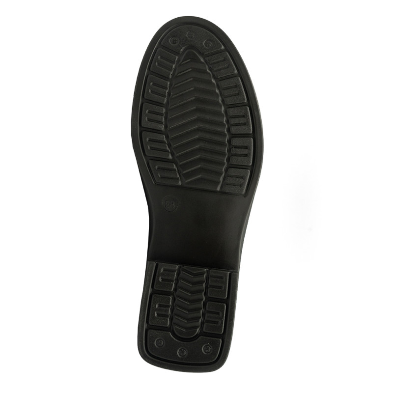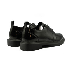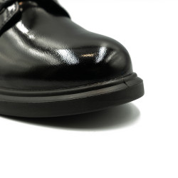 Juodos spalvos bateliai dekoruoti įvairiomis detalėmis.
