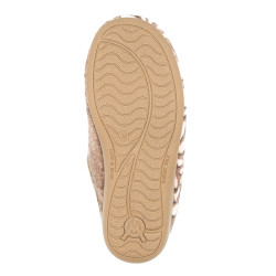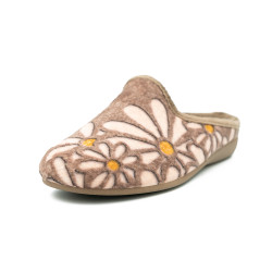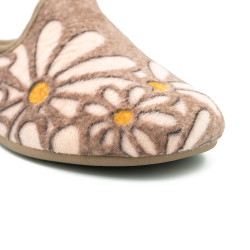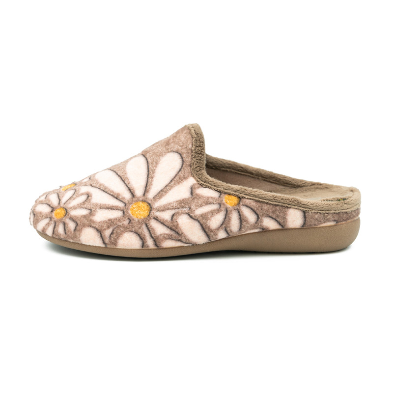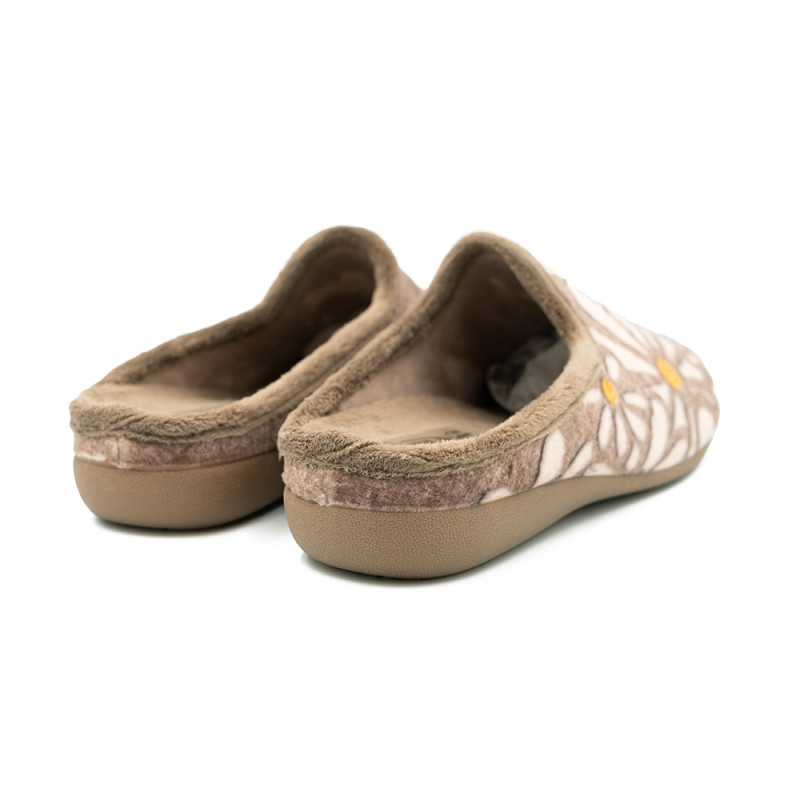 Smėlio spalvos uždaros šlepetės dekoruotomis įvairiomis detalėmis.