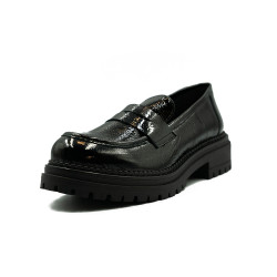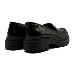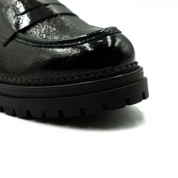 Juodos spalvos bateliai dekoruoti įvairiomis detalėmis.