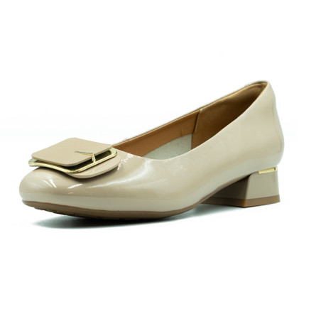 Smėlio spalvos bateliai dekoruoti įvairiomis detalėmis.