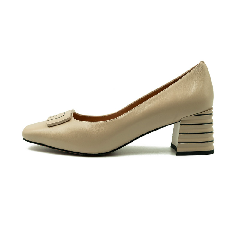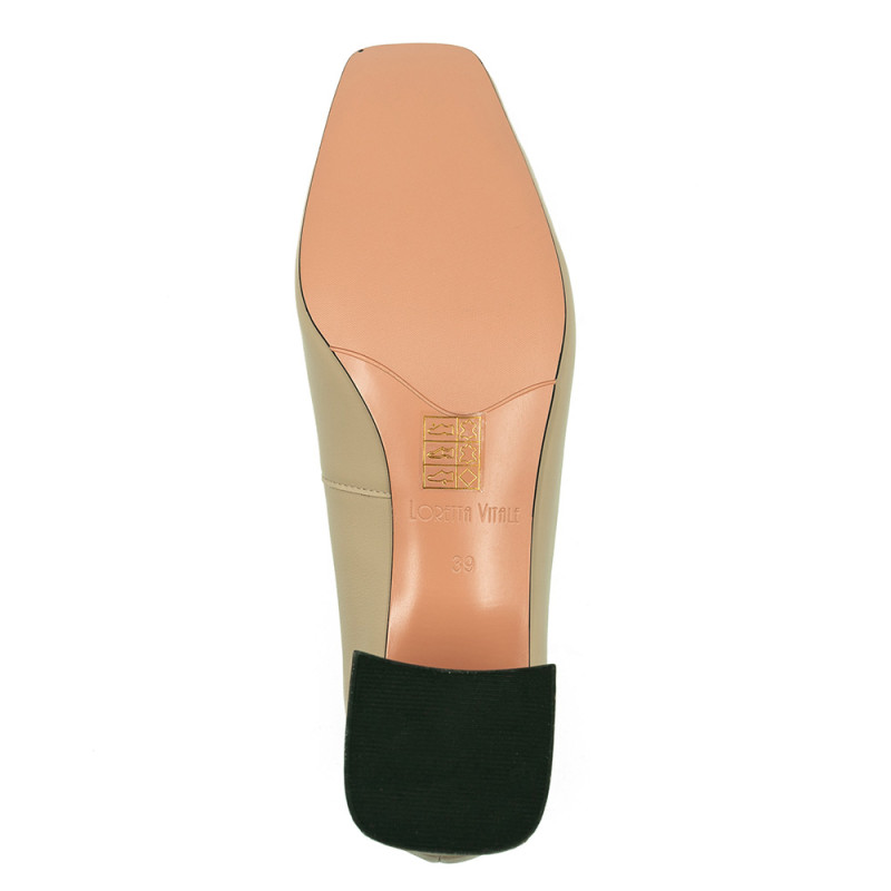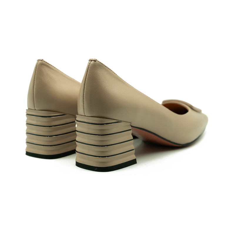 Smėlio spalvos bateliai dekoruoti įvairiomis detalėmis.