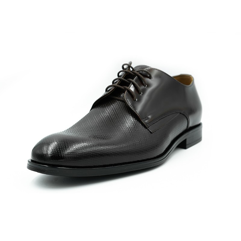 Vyriški, pagaminti iš natūralios odos, papuošti smulkia perforacija, tamsiai rudos spalvos klasikinio tipo bateliai. Bateliai tinkantys avėti prie kostiumų įvairiomis progoms. Bateliai su lygiu 2 cm padu.
