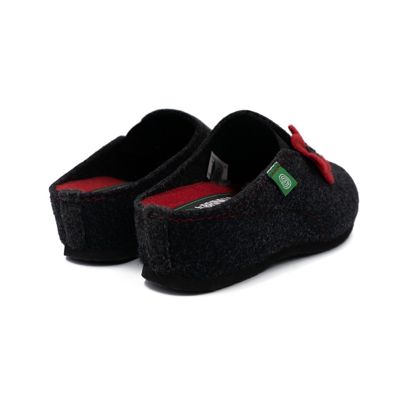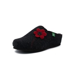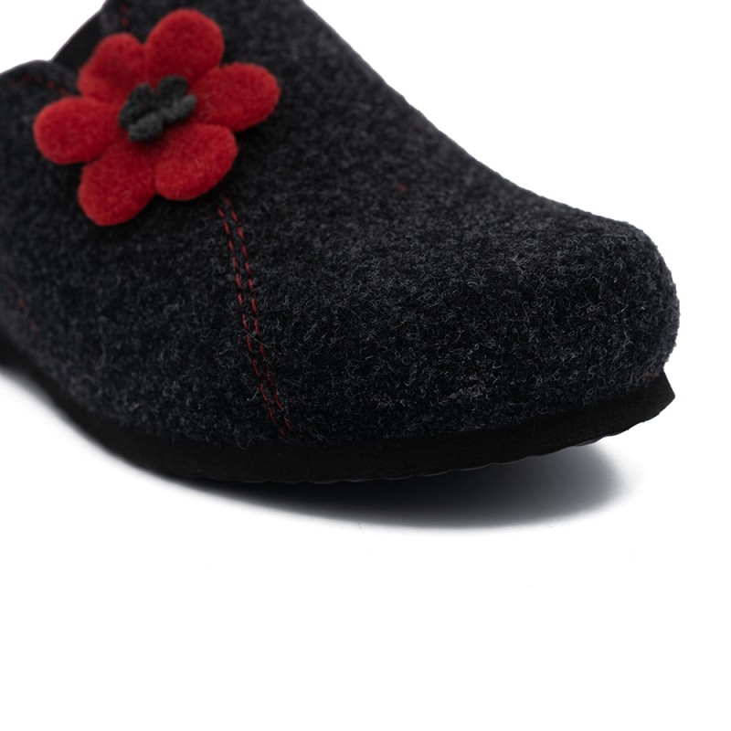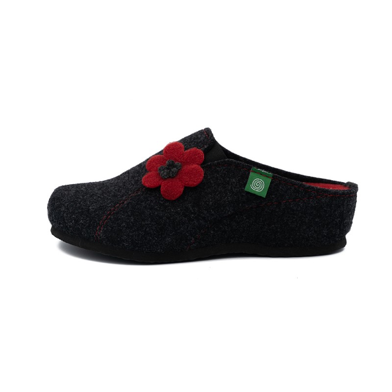 Pilkos spalvos šlepetės dekoruotos žaisminga gėlytės dekoracija ant šlepečių priekio.