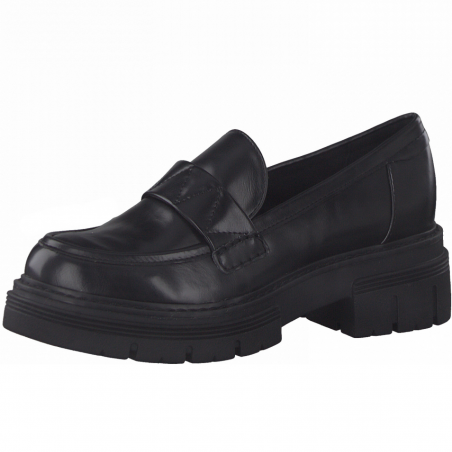Juodos spalvos bateliai dekoruoti įvairiomis detalėmis ir grubiu padu.