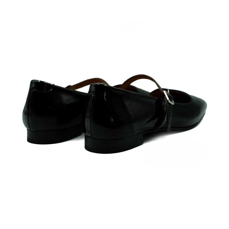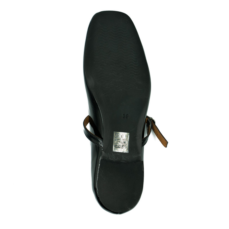 Juodos spalvos bateliai dekoruoti įvairiomis detalėmis.