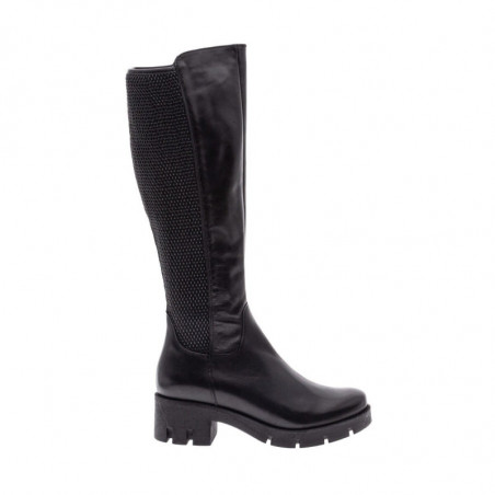 Juodos spalvos ilgaauliai su komfortiško aukščio kulnu ir filco pašiltinimu viduje.