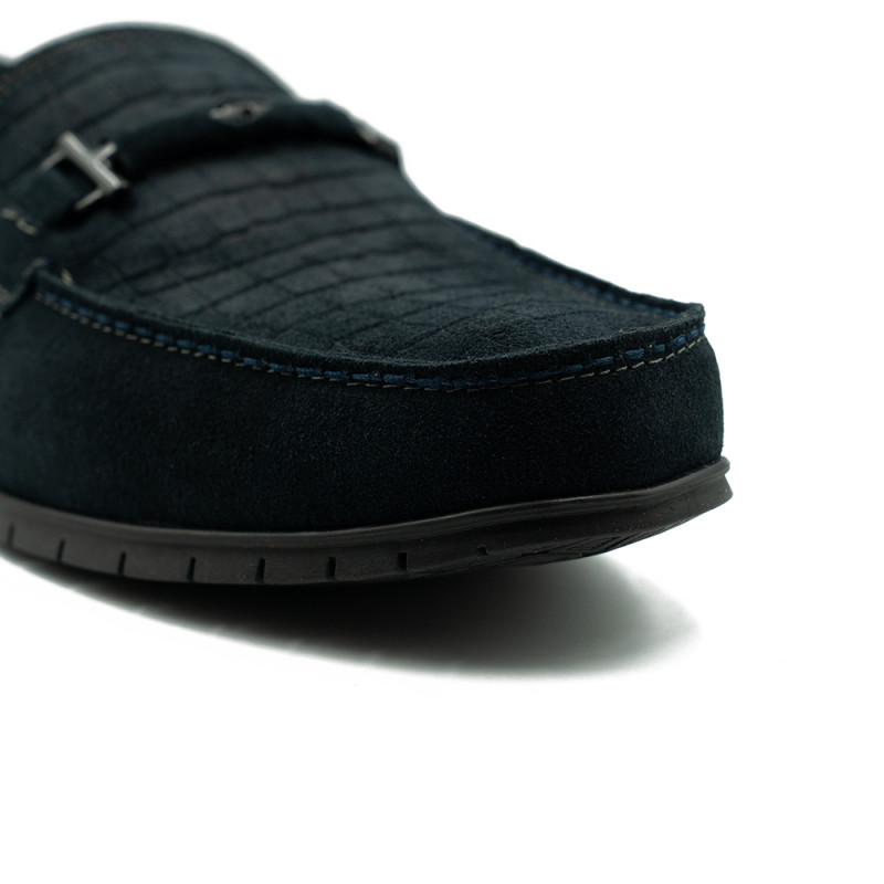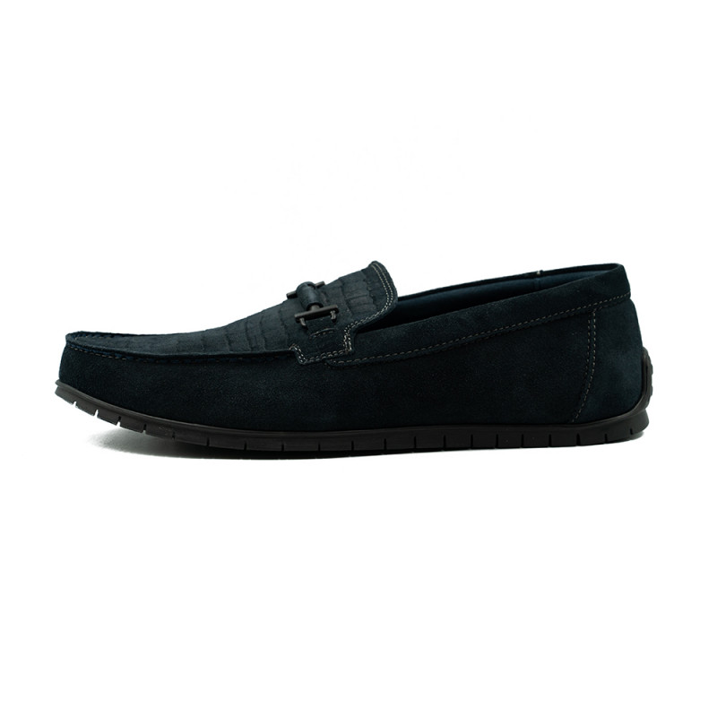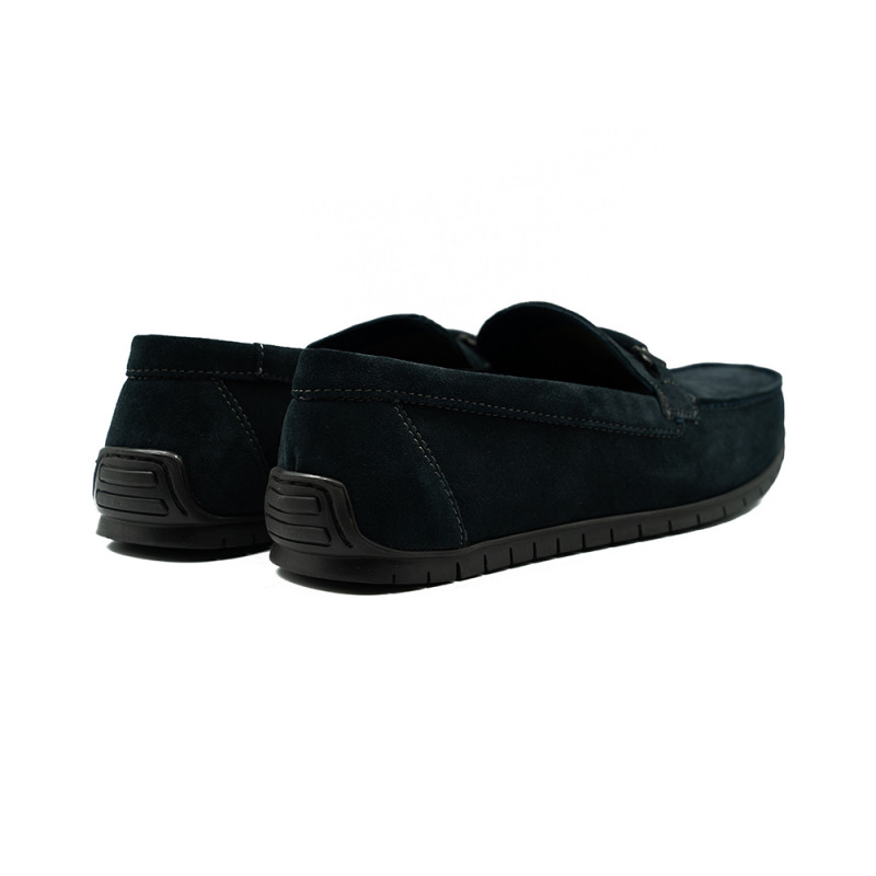 Mėlynos spalvos mokasinai dekoruoti siūlėmis ir įvairiomis detalėmis.