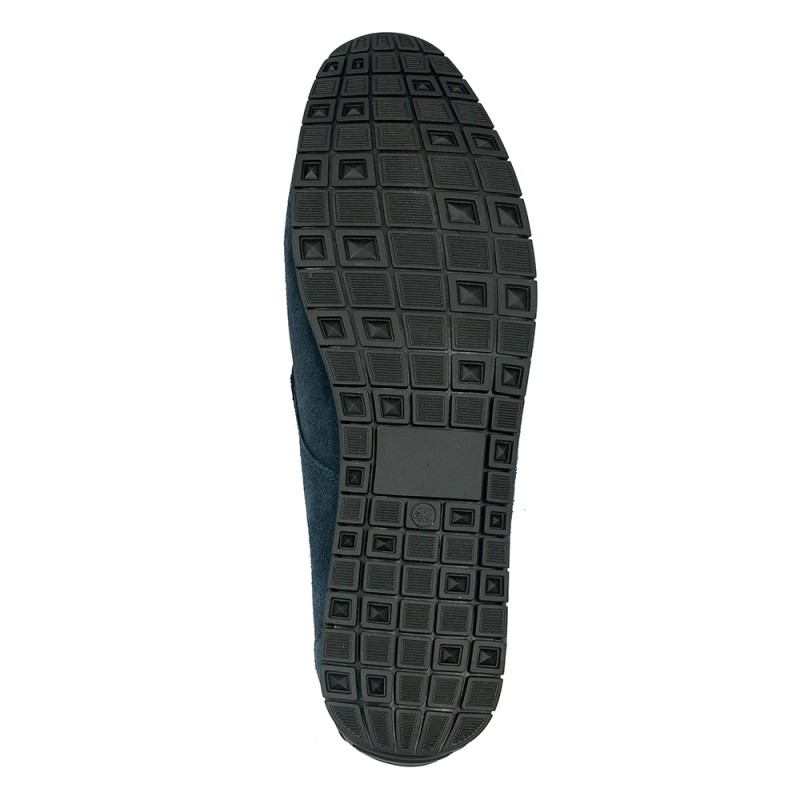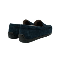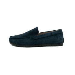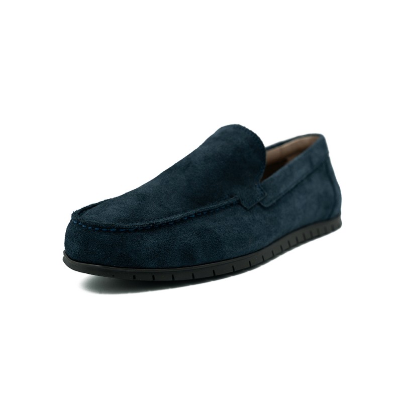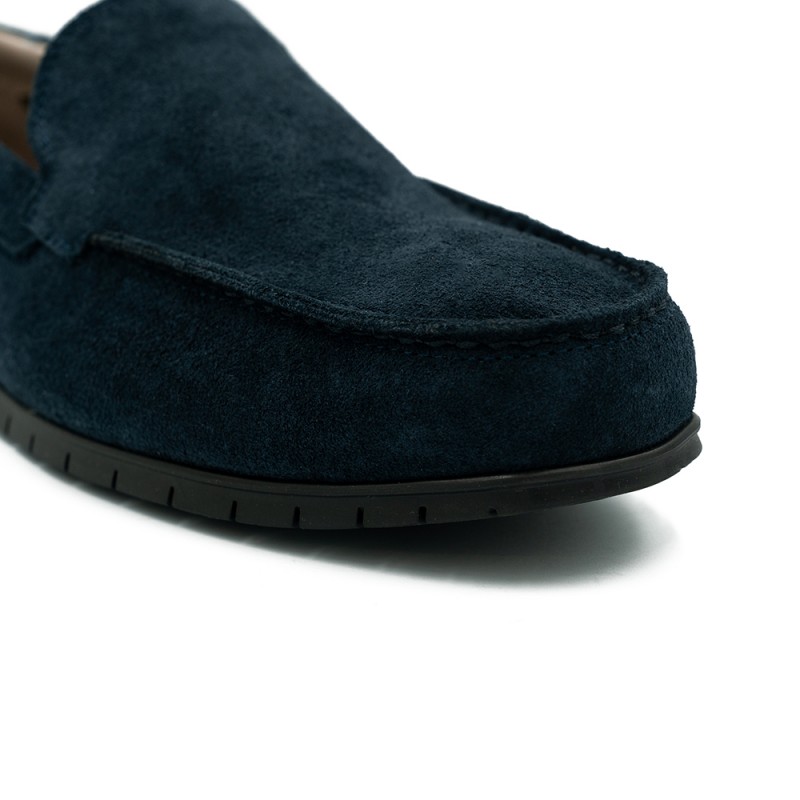 Mėlynos spalvos mokasinai dekoruoti siūlėmis ir įvairiomis detalėmis.