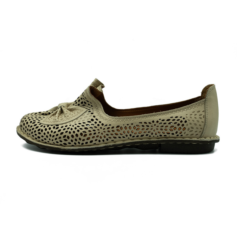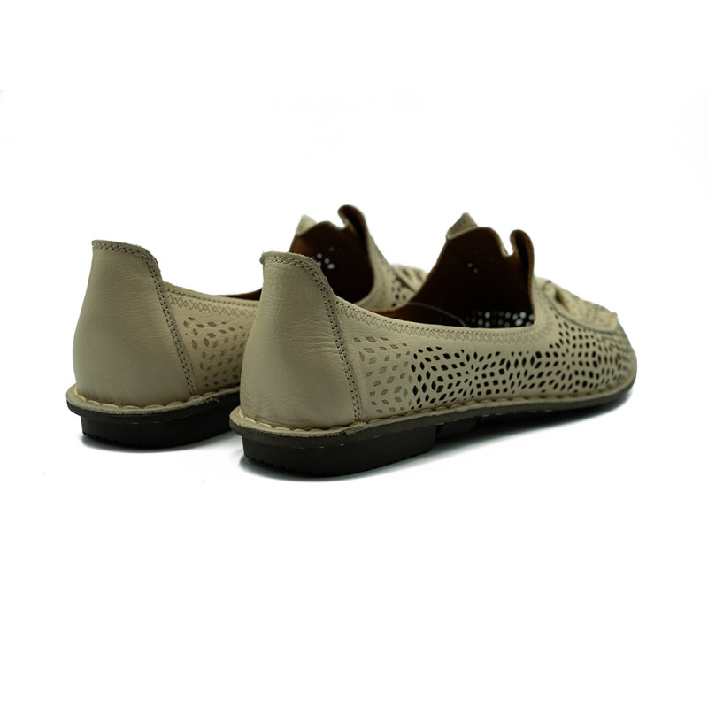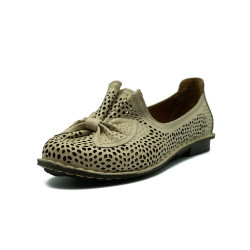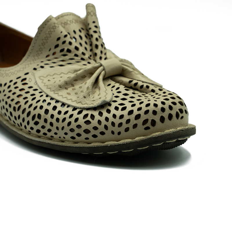 Smėlio spalvos bateliai dekoruoti įvairiomis detalėmis.