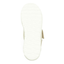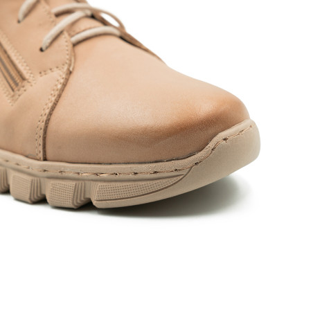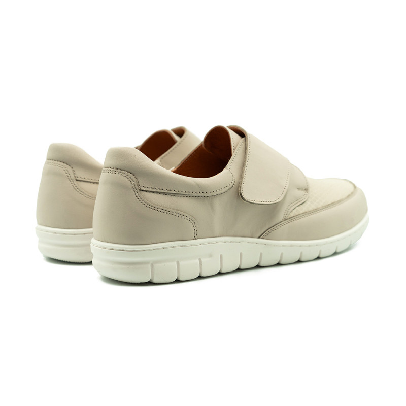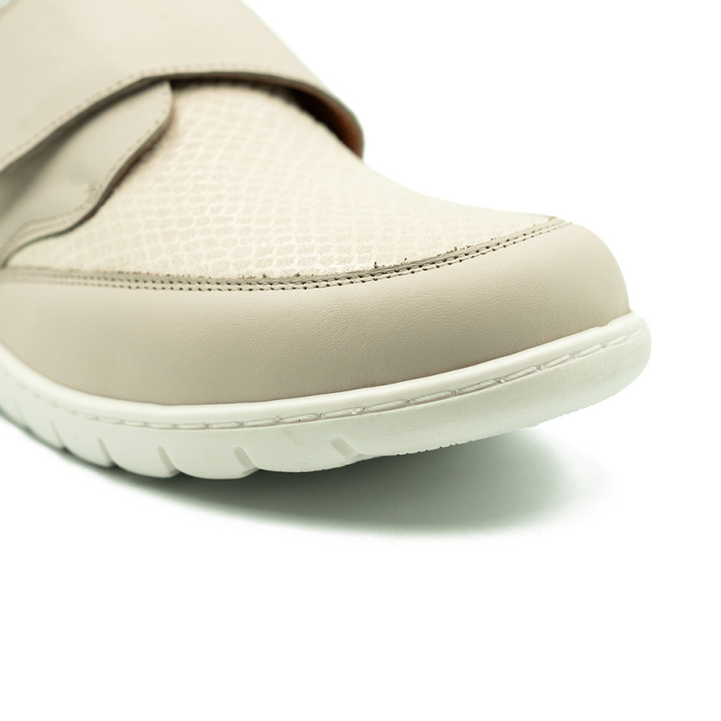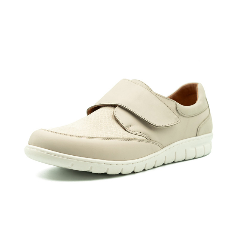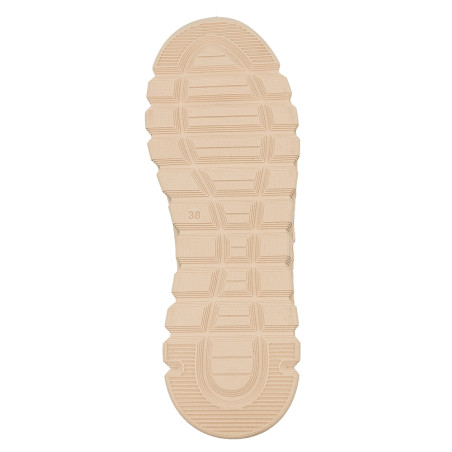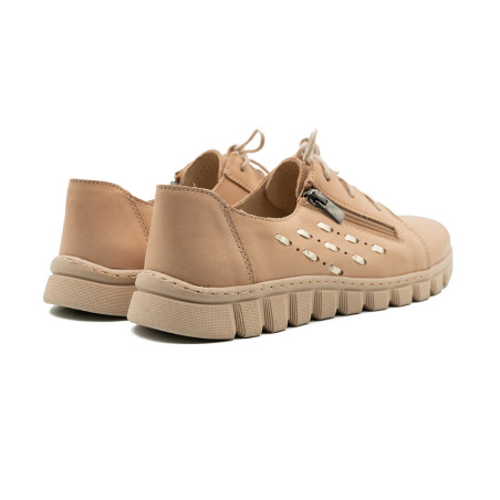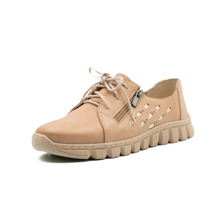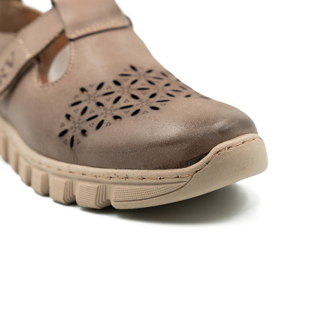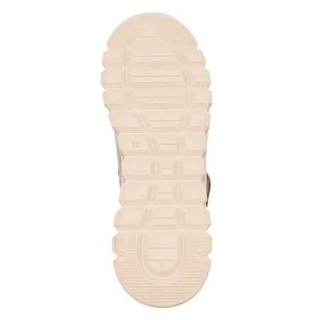 Smėlio spalvos bateliai dekoruoti įvairiomis detalėmis.