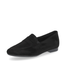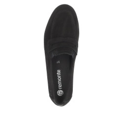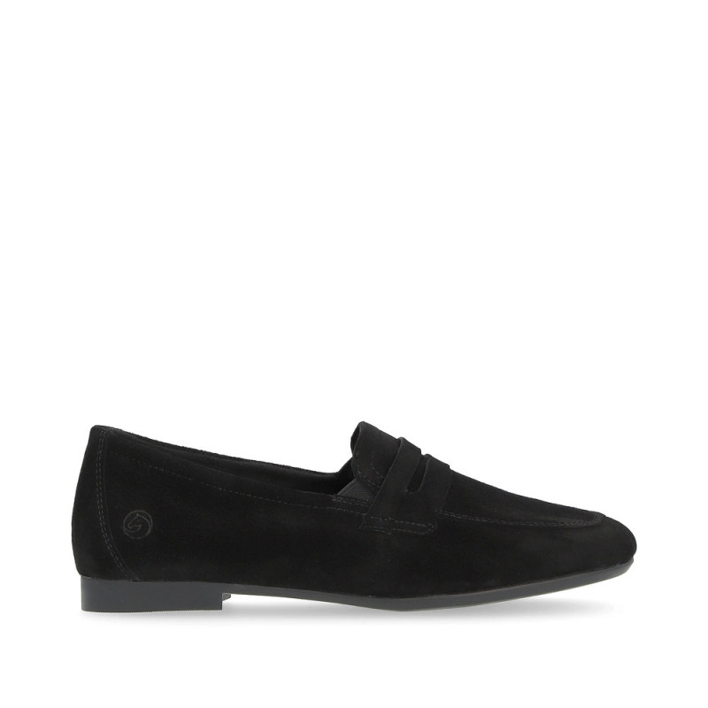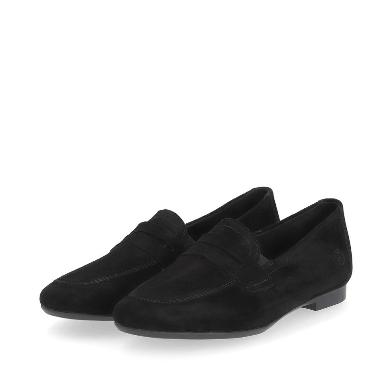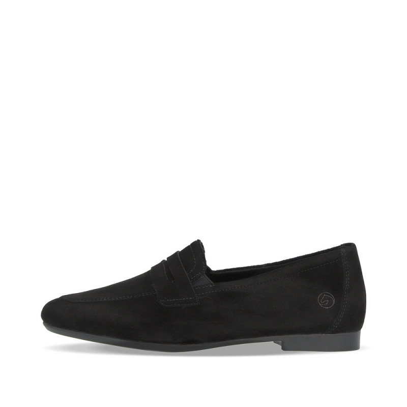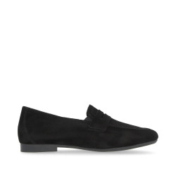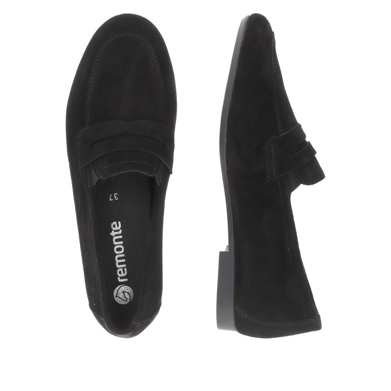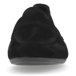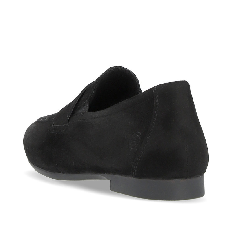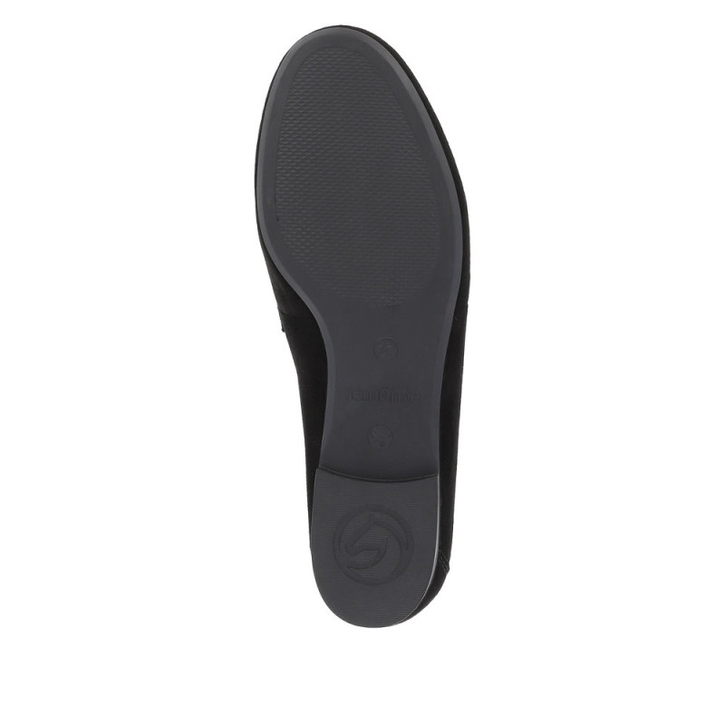 Juodos spalvos bateliai dekoruoti įvairiomis detalėmis.