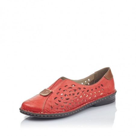 Moteriški odiniai žemapadžiai bateliai, raudonos spalvos. Bateliai perforuoti, labai lengvi ir patogūs, turintys odinį vidpadį, todėl juo galėsite puikiai avėti basomis kojomis.