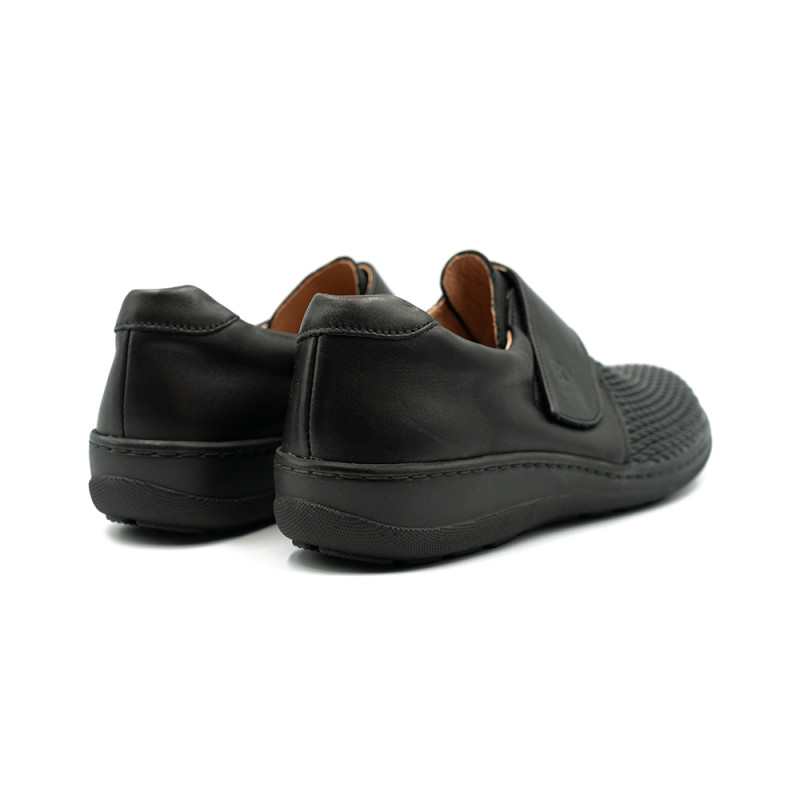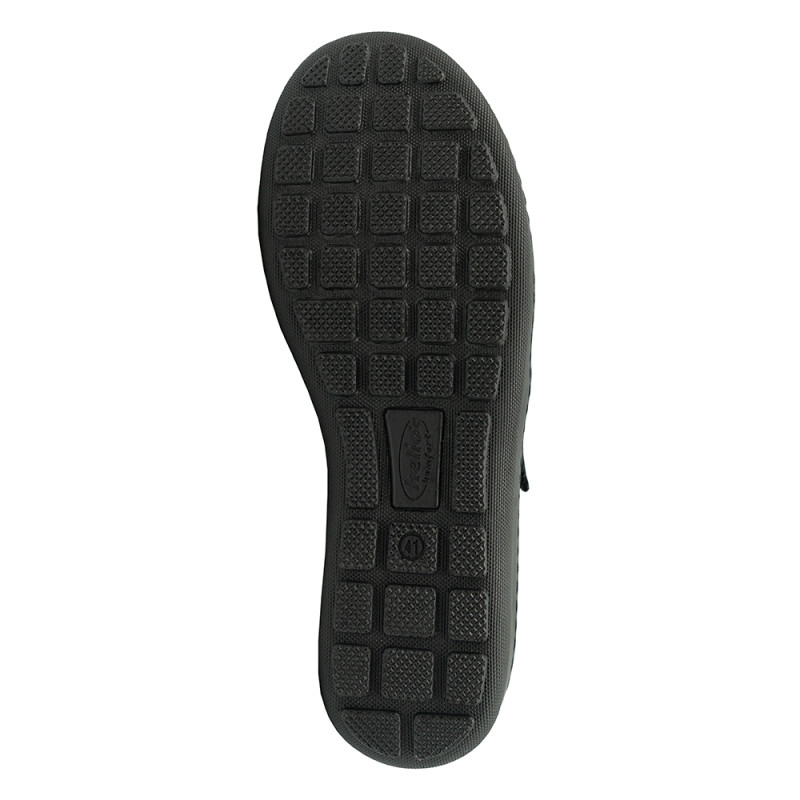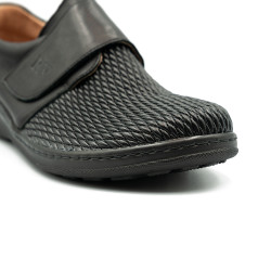 Juodos spalvos bateliai dekoruoti įvairiomis detalėmis.