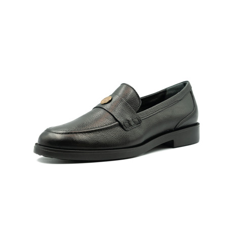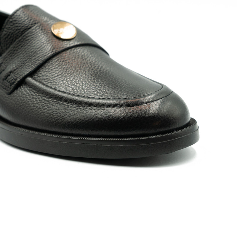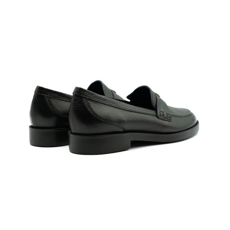 Juodos spalvos bateliai dekoruoti įvairiomis detalėmis.