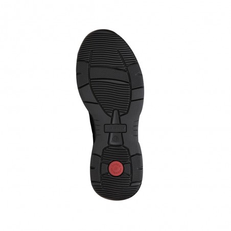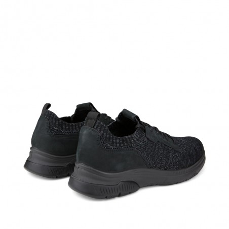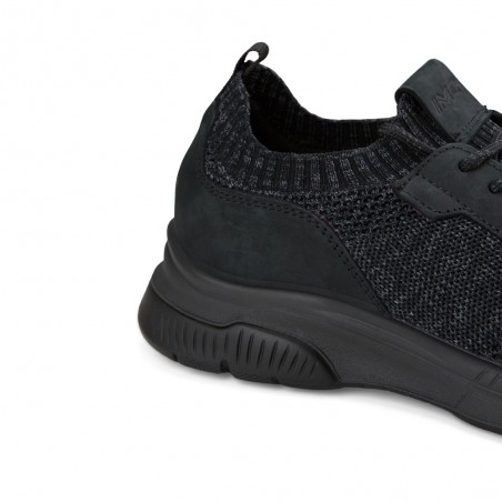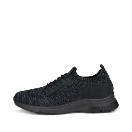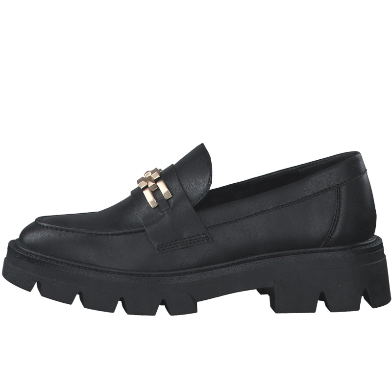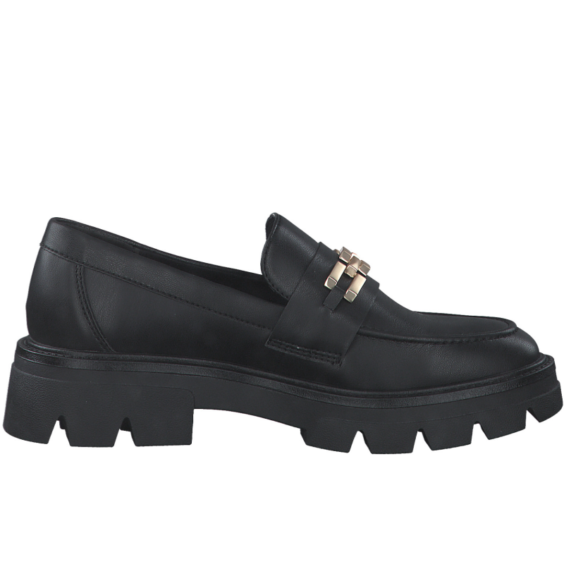 Juodos spalvos bateliai dekoruoti įvairiomis detalėmis.