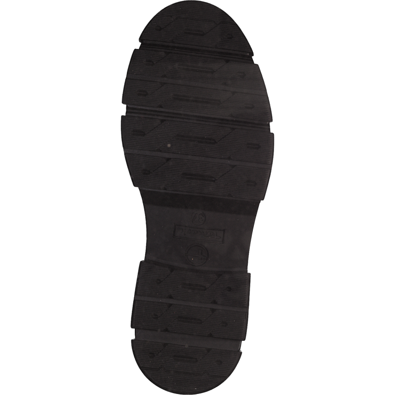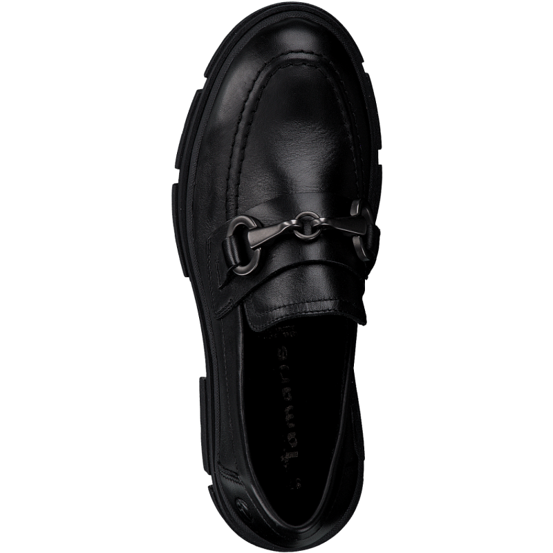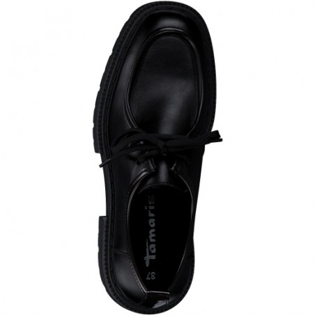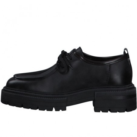 Juodos spalvos bateliai dekoruoti įvairiomis detalėmis.