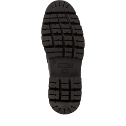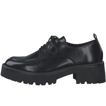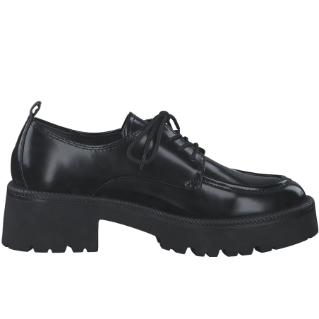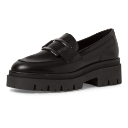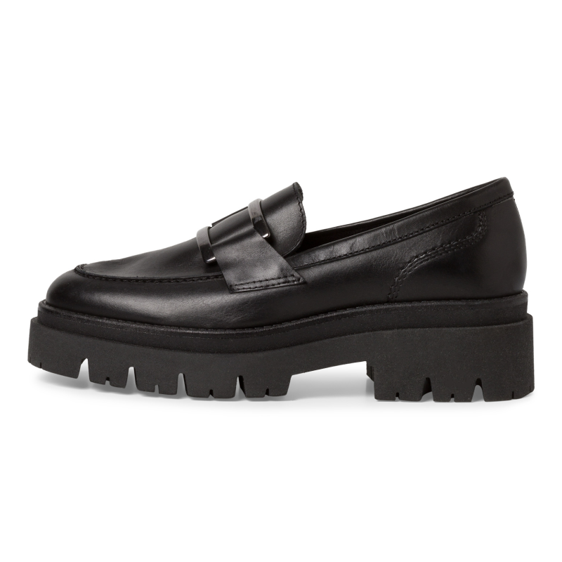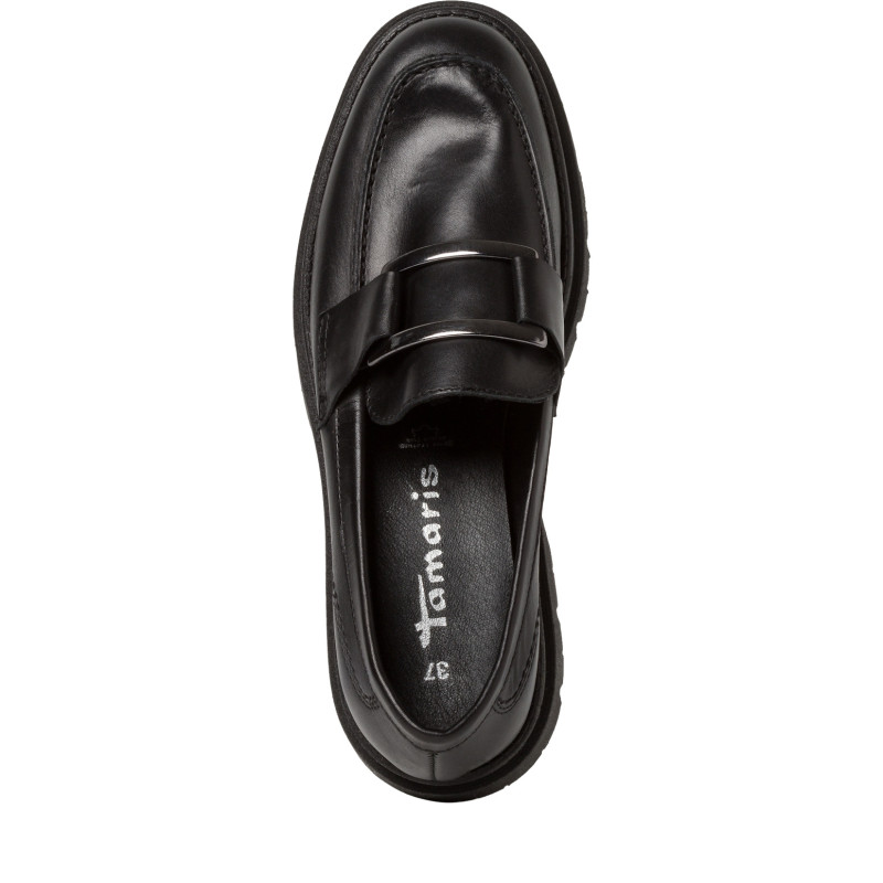 Juodos spalvos bateliai dekoruoti įvairiomis detalėmis.