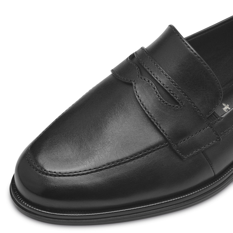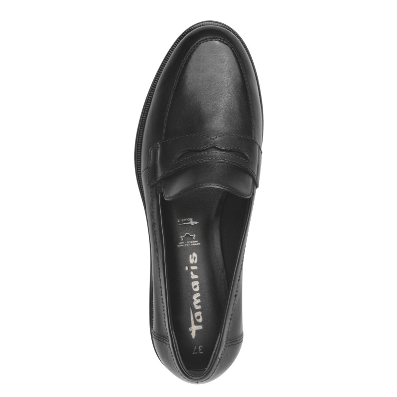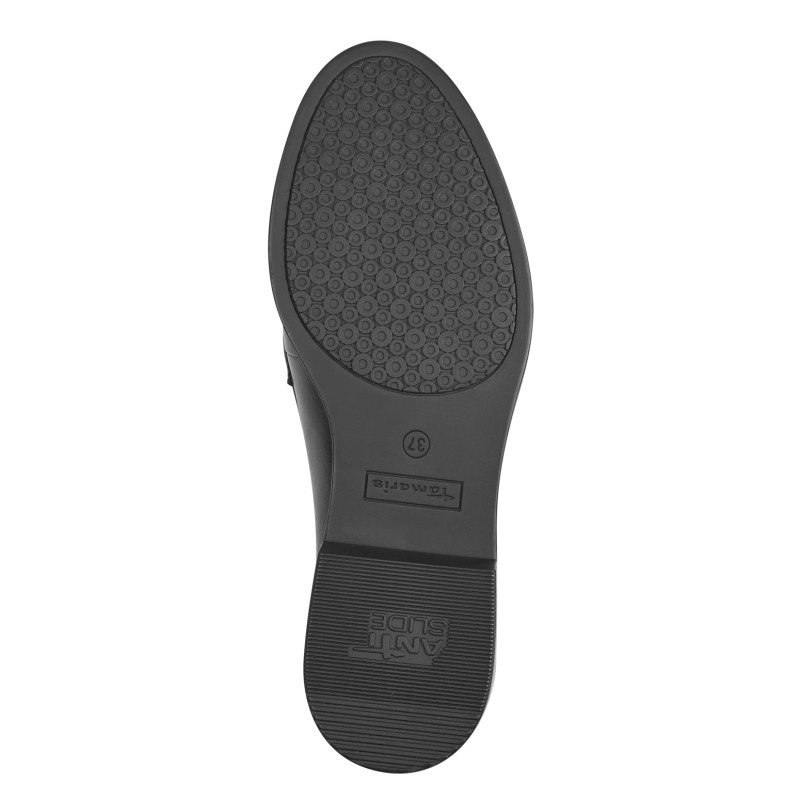 Juodos spalvos bateliai dekoruoti įvairiomis detalėmis.