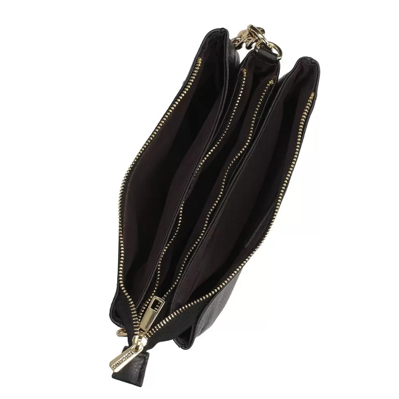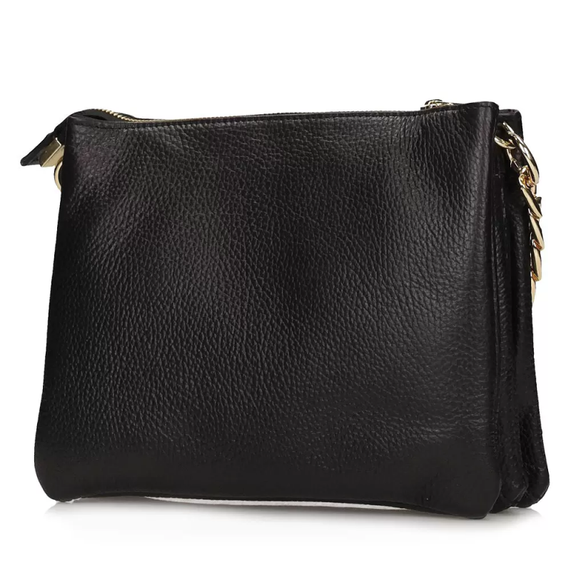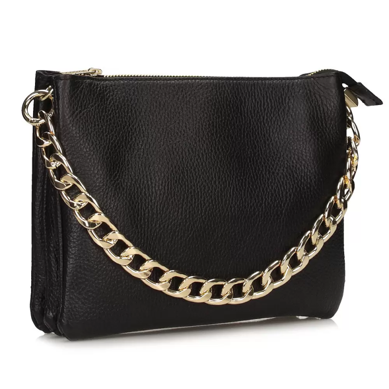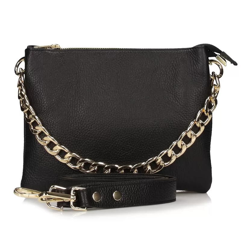 Rankinė pagaminta iš natūralios odos, turi vieną pagrindinį užtrauktuku užsegamą skyrių, viduje padalintą į tris mažesnius skyrius. Gaminys pakabinamas ant elegantiškos grandinėlės, komplekte taip pat yra nuimamas storas dirželis.