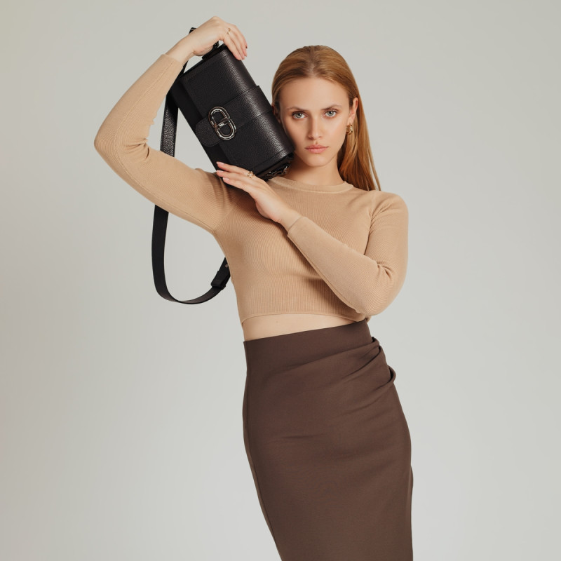 Rankinė pagaminta iš natūralios itališkos odos, su vienu pagrindiniu skyriumi, uždarytu atvartu su užtrauktuku ir užtrauktuku, su viena mažesne kišene viduje. Rankinė kabo ant reguliuojamo dirželio. Rankinė su – dekoratyvine sagtimi.